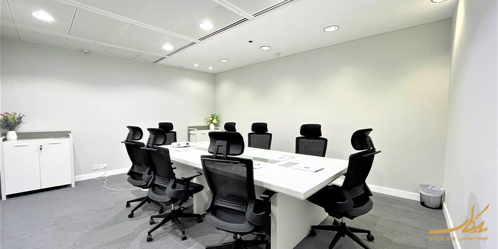 - نورپردازی مناسب: اولین نکته توجه به نورپردازی سالن کنفرانس است. به شکلی که از توزیع نور با شدت روشنایی مناسب در سطح میز کار انجام شود. در این باره لازم است تا آگاهانه از چراغها و لامپهای سقفی توکار با نمای مناسب و هدفمند استفاده کنیم.
